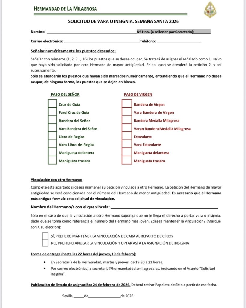 El formulario podrá descargarse desde la web de la Hermandad o enviarse cumplimentado al correo electrónico: