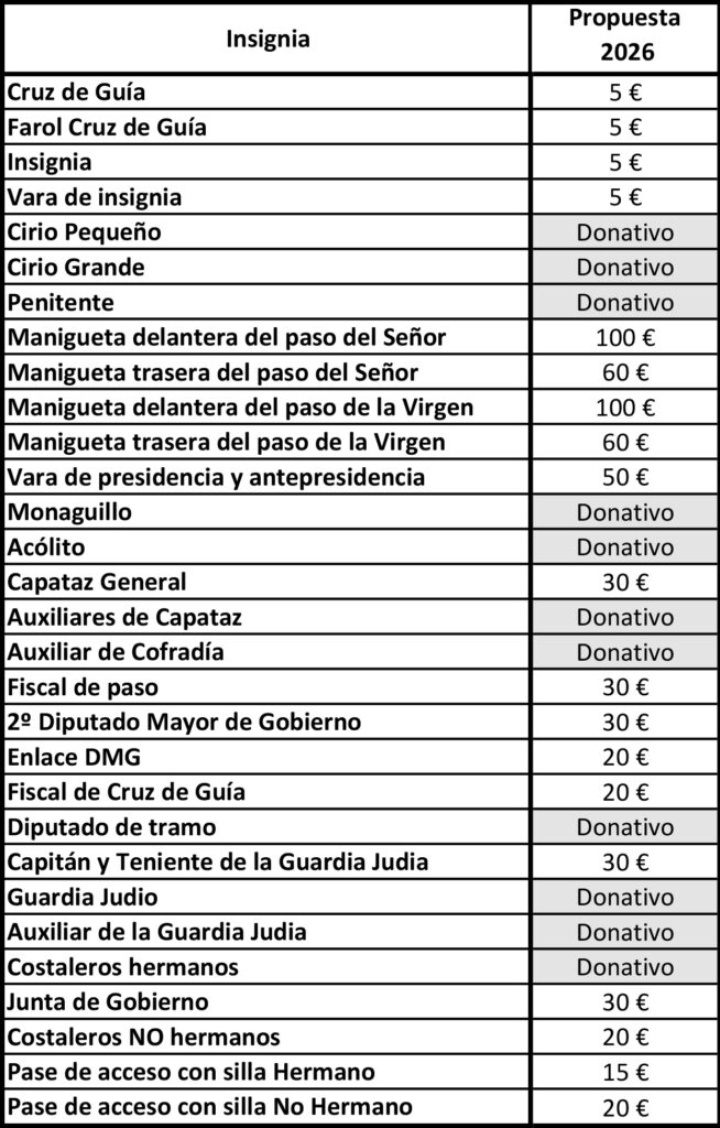 La asignación de insignias y varas se realizará exclusivamente por orden de antigüedad en la nómina de hermanos, atendiendo a la fecha de alta en la Hermandad.